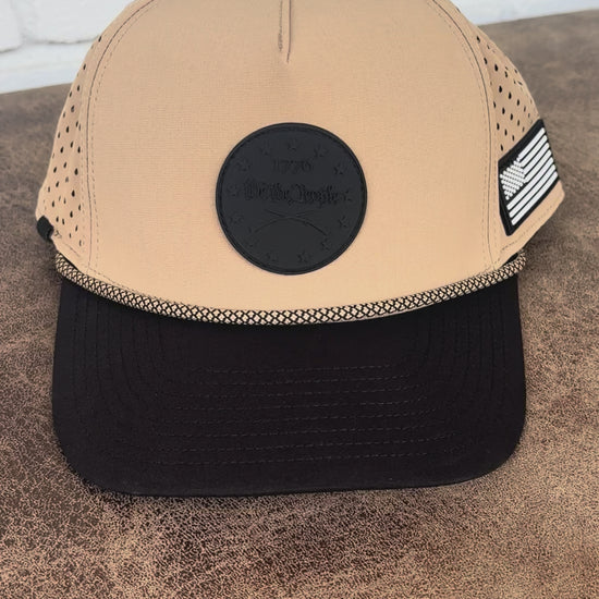 - Title: Curves & Clubs 1776 American Golf Hat β Tan Performance Rope Cap - American Flag Side Patch. π