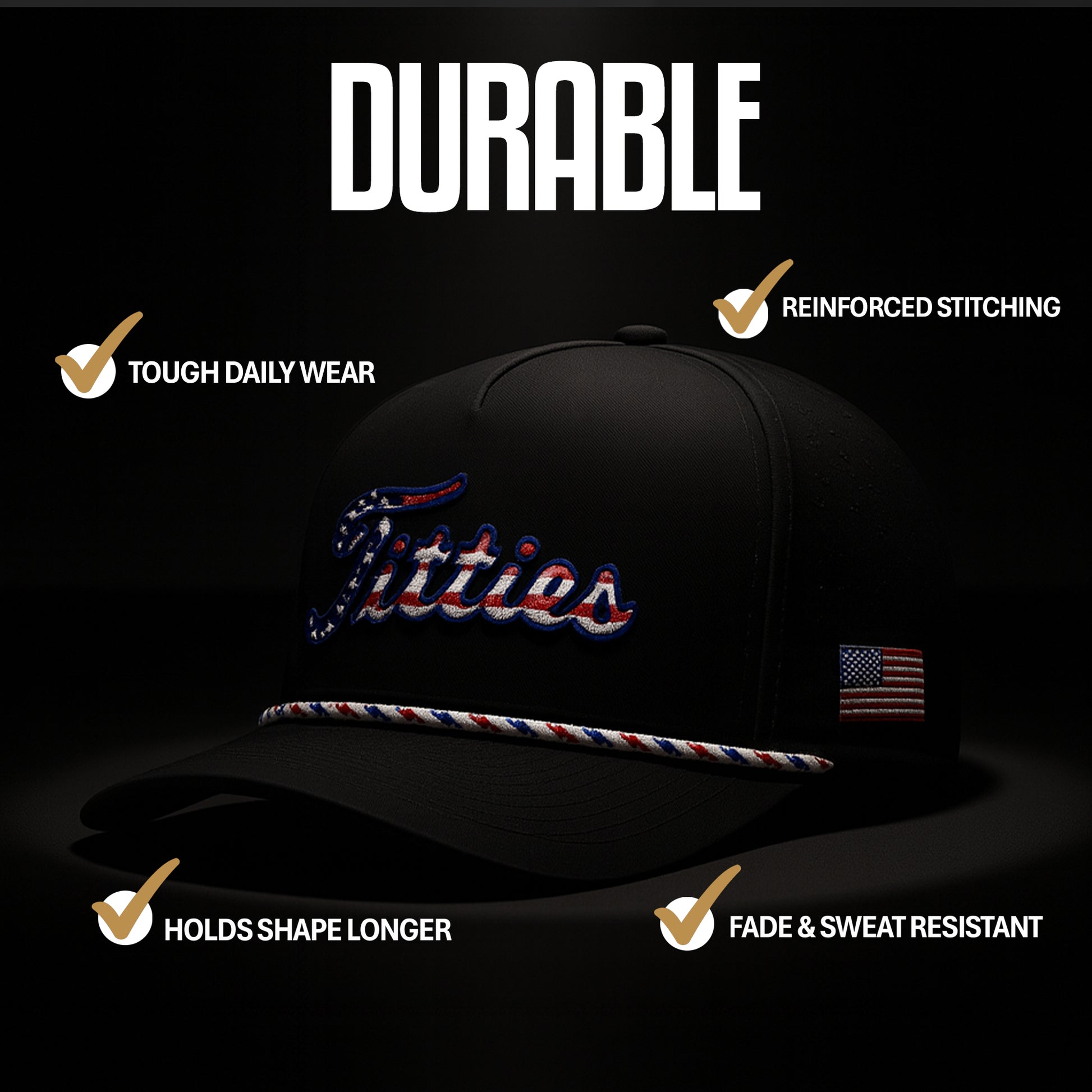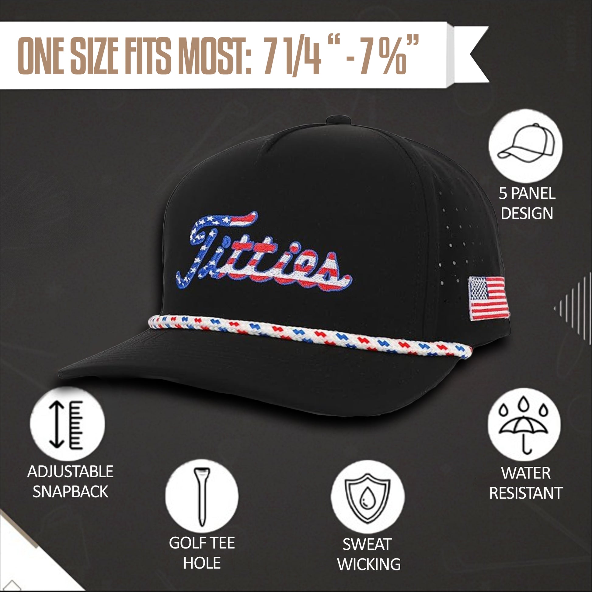 Bring a playful twist to your golf game with the Curves & Clubs Black Waterproof Titties Golf Hat. Featuring bold "Titties" embroidery in patriotic red, white, and blue, along with an American flag patch, this hat is the ultimate conversation starter. Perfect for golfers who love to have fun while making a statement.