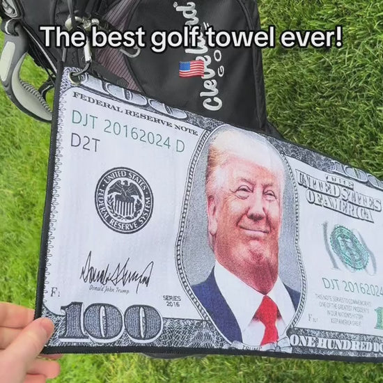 FUN AND UNIQUE DESIGN: The Trump dollar bill motif adds a playful element to your game while serving as a conversation starter on the course. This towel is designed to make your golfing experience both practical and enjoyable.