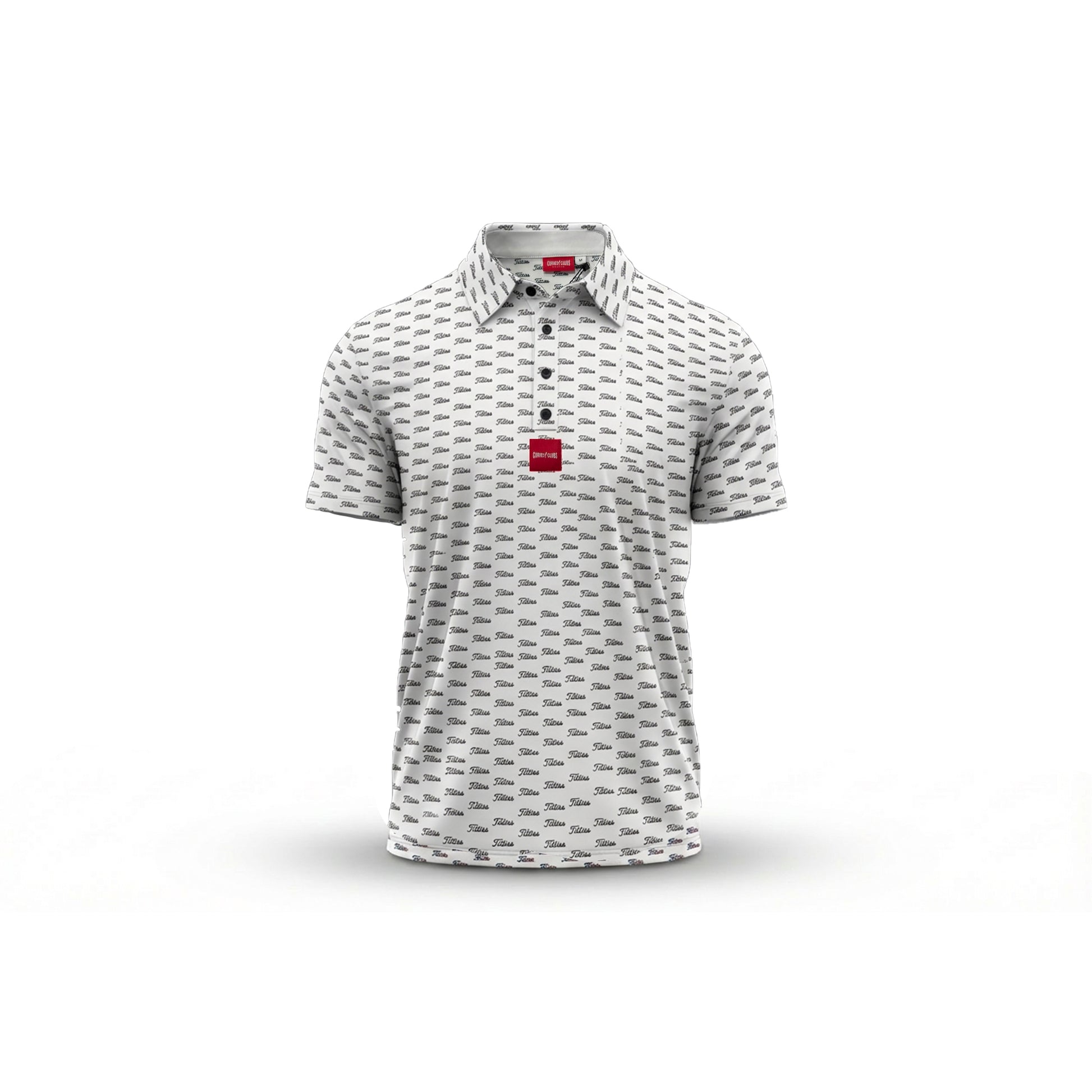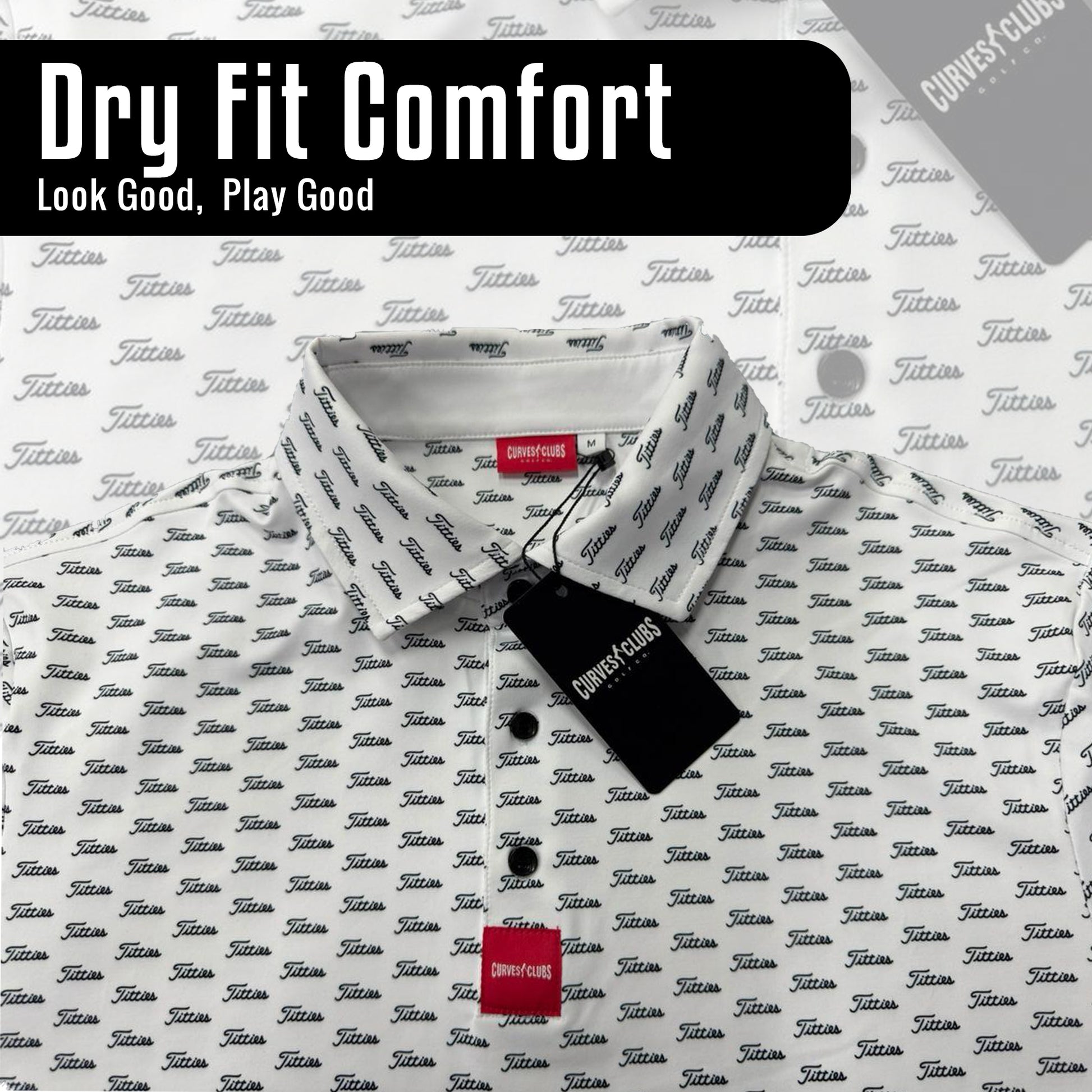 Rep the cheeky script and smooth swings in the White Titties Golf Polo. This bold polo features an all-over repeating "Titties" script pattern in black on a crisp white base, delivering a sleek monochrome golf polo vibe that looks sharp on the course. Built with lightweight, breathable, dry-fit fabric, it keeps you cool whether you're chasing birdies or hanging with the crew at the 19th hole.